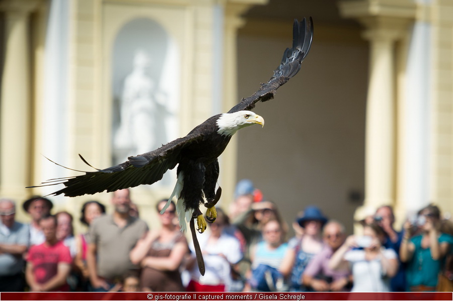Aber auch weitere Highlights waren neben den genannten Programmpunkten zu sehen. Ein Falkner war vor Ort, der die Flugkünste seiner Vögel zeigte und ausgiebig das Wesen der Tiere erklärte. Nur einer, der sah die Gunst der Stunde: Ein Weißkopf-Seeadler, der Gotte sei Dank einen Sender hatte, genießte das Publikum, setzte im Tiefflug darüber hinweg und war es dann auch… weg…. Bis zum Veranstaltungsende kam er zumindest nicht zurück, hoffen wir mal, dass er nicht ganz den Weg in die Freiheit suchte, aber Dank Sender weiß zumindest der Besitzer, wo er ist…